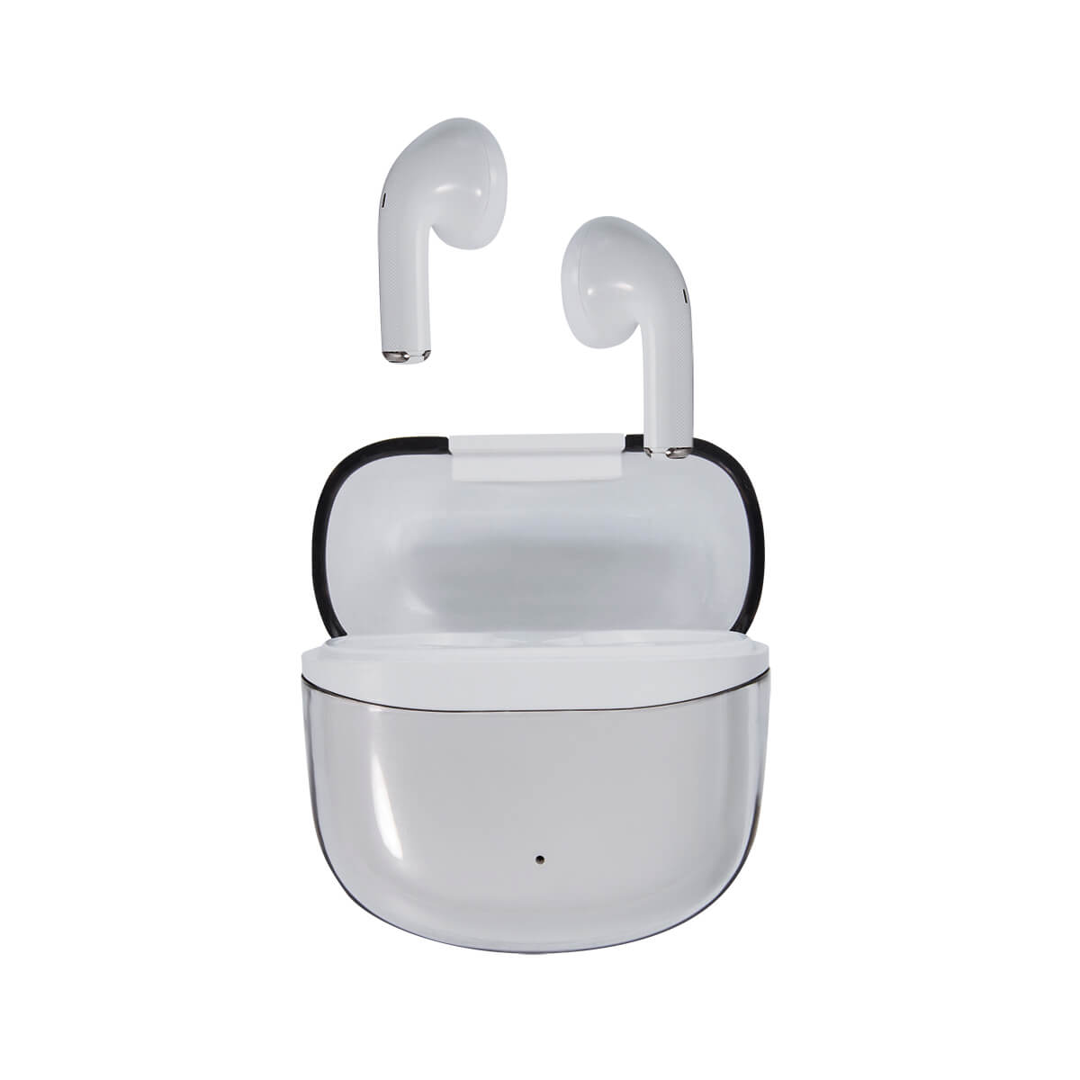 Audifonos bluetooth con base recargable. Controles integrados touch para llamadas, volumen y reproduccion de audio. Reproduccion de musica 2 a 3 hrs aproximadamente. Rango de conexion de 10 metros. Incluye estuche de carga y cable cargador USB.