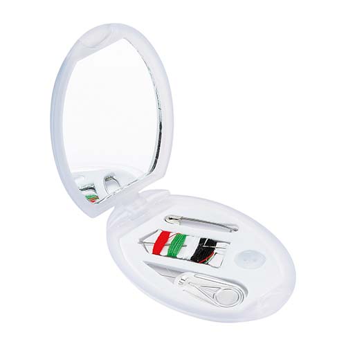 Incluye ensartador de aguja, boton, hilo, aguja, seguro y estuche con espejo.