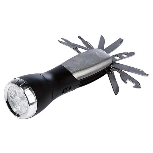 Lampara de 4 LEDS con flash. Incluye destapador, tijeras y 6 diferentes navajas con distintas funciones. Incluye 3 baterias AAA.