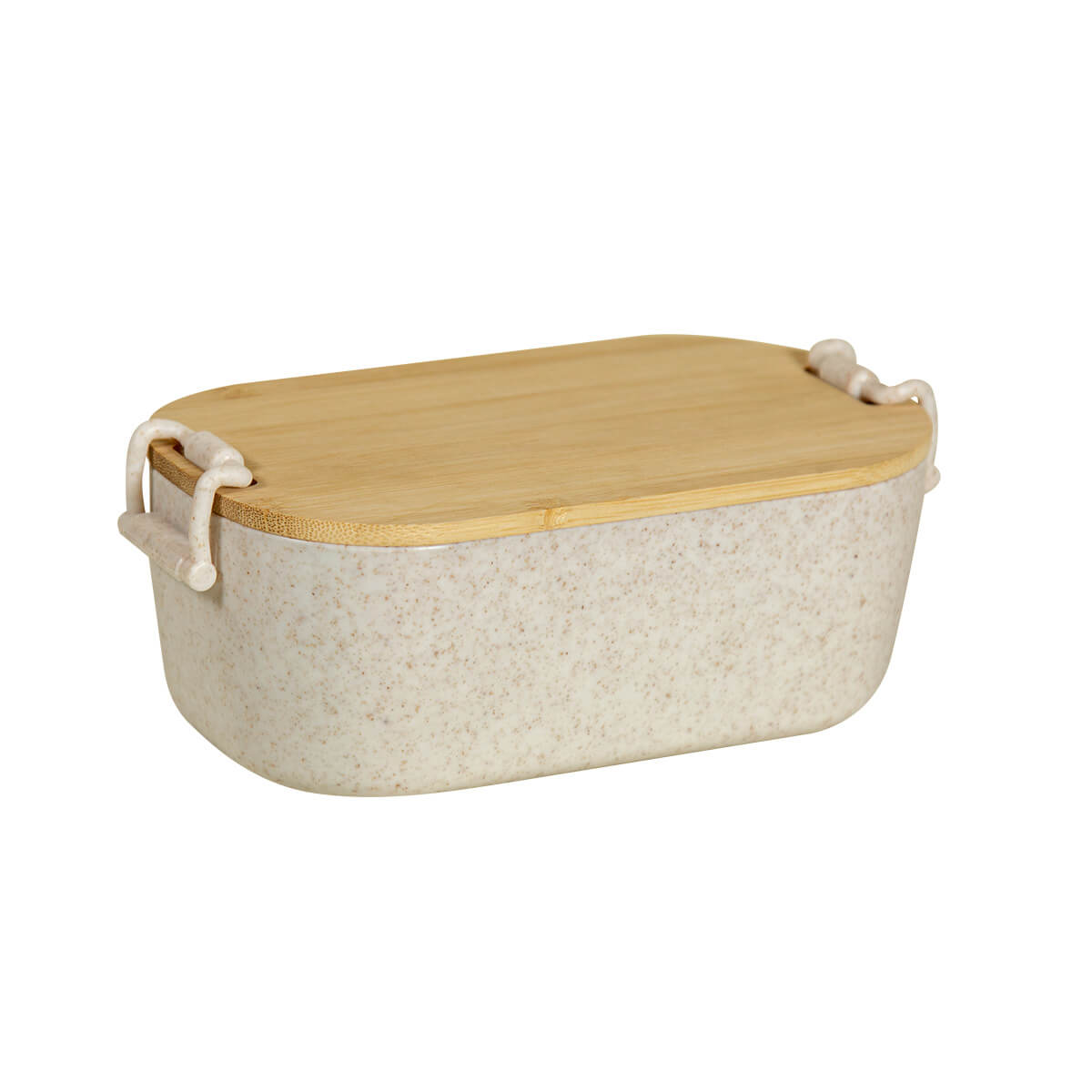 Lonchera de plastico con un toque natural y elegante, su tapa de bambu se asegura con dos broches de plastico, para mantener la lonchera cerrada. En su interior, cuenta con un practico tenedor y un pequeno contenedor destinado para salsas, aderezos o especias. Esta lonchera no solo ofrece un diseno atractivo, sino tambien, la versatilidad necesaria para llevar tus alimentos de manera organizada. Apto para el uso en microondas y lavavajillas. La madera es un producto natural el cual puede presentar variaciones en tonalidades y vetas.