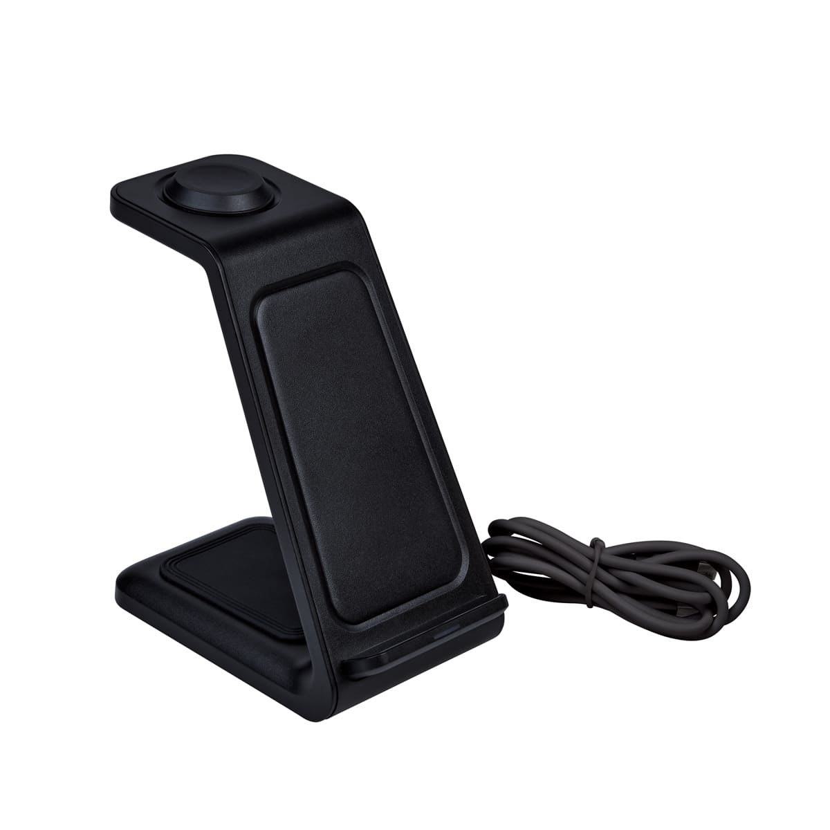 Cargador inalambrico con triple funcion. Incluye estacion de carga para smartphone, reloj inteligente y audifonos. Wireless de 15W / 10W / 7.5W / 5W / 3W. Incluye cable de 1m con conector tipo C. Compatible con dispositivos que cuenten con tecnologia de carga inalambrica.