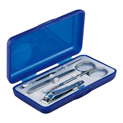 Set con 1 tijeras, 1 pinza para cejas, 1 corta unas y 1 retira cuticula. No para uso profesional.